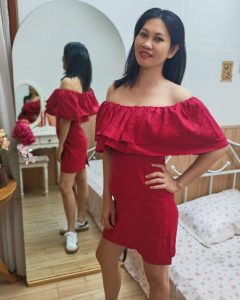 Off the shoulder dress with ruffled neck.