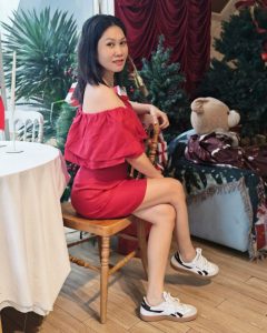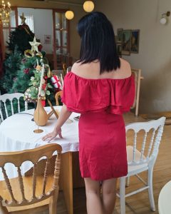 Off the shoulder dress with ruffled neck.
